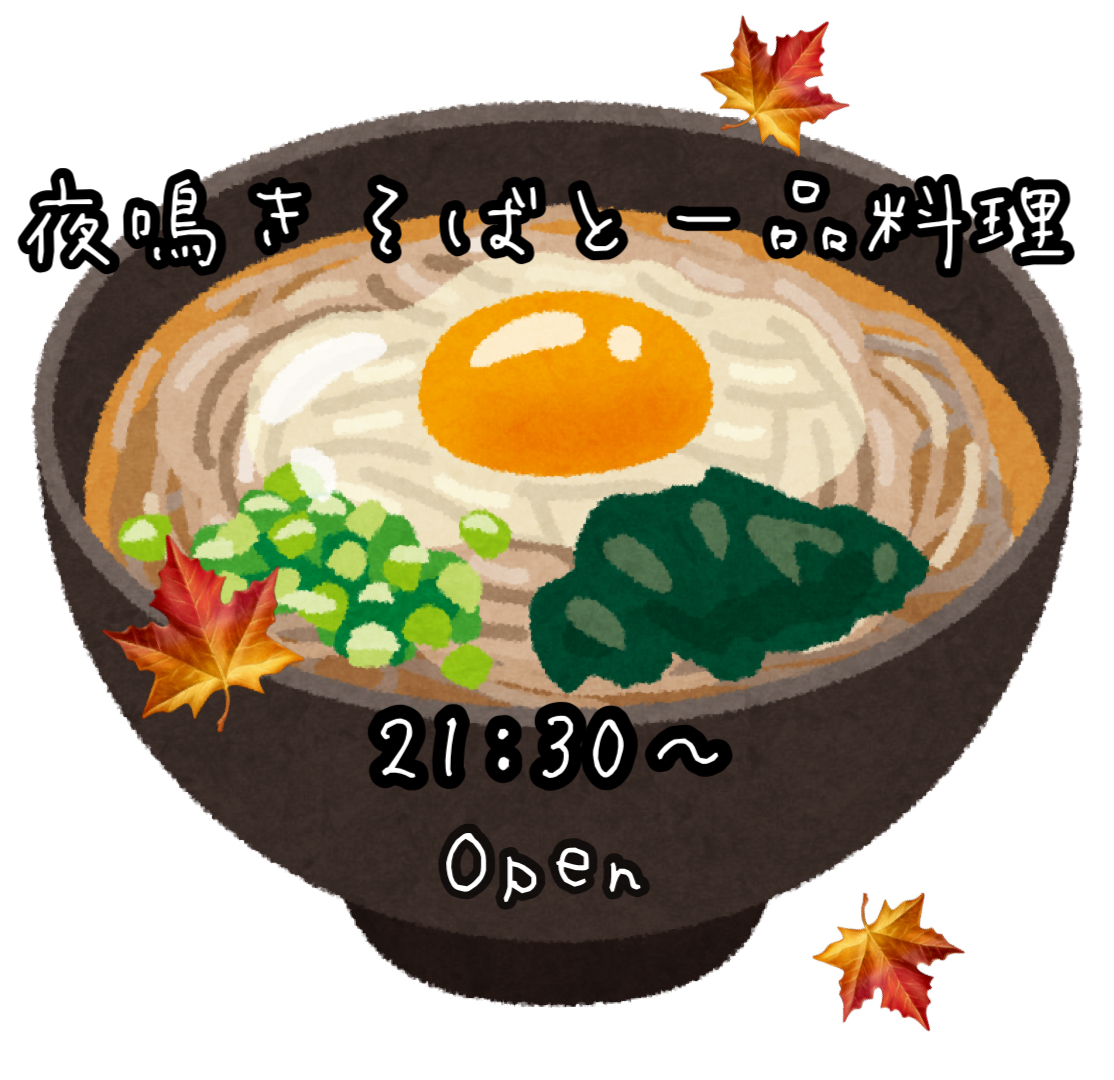 21時半からのお楽しみ イベント告知 2024年09月17日 9月20,21日 今週末の金土両日、21時以降お蕎麦営業!!当店人気「手打ちそば」をはじめ、各種一品料理のメニュー揃え飲みの帰りの一杯にでも是非お立ち寄り下さい!「唐戸は店が早く閉まる」とよくいわれますが、お隣のステーキ店“エビス”さん深夜二時まで営業中!仕入れやタイミングにもよりますがウチも夜型需要ウエルカムでチャレンジ致しますのでお気軽にどうぞ